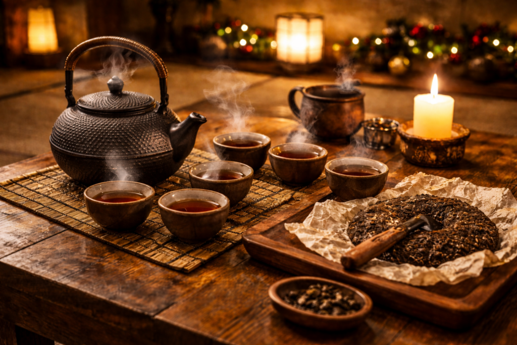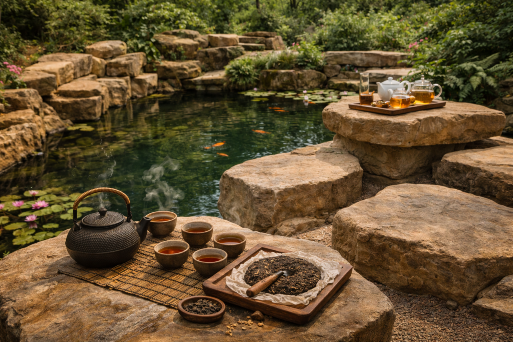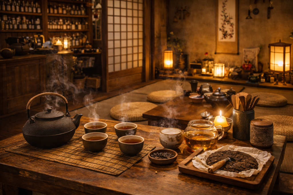 Čajové lístky, konvičky, šálky a pu-erh Základem této části je čaj v jeho přirozené podobě. Čajové lístky, které se v horké vodě pomalu rozvíjejí, konvička, která drží teplo, a šálky, ze kterých se pije beze spěchu. Každý nálev je malý rituál a každý doušek chvílí, která stojí za pozornost. Pu-erh zde má své pevné místo. Hloubka chuti, zemitost a postupné vrstvy, které se odhalují s každým dalším zalitím, vytvářejí jiný druh zážitku než běžný šálek čaje. Je to čaj na čas, ne na rychlé pití. Čaj, který se vyvíjí a dává prostor klidu i soustředění. Konvičky a šálky nejsou jen nástroje, ale součást atmosféry. Dotyk, teplo v dlaních a ticho mezi nálevy vytvářejí prostředí, kde není potřeba nic uspěchat. Tato část TeaHouse nabízí prostor pro zastavení, přemýšlení i tiché sdílení – v rytmu, který určuje čaj sám.